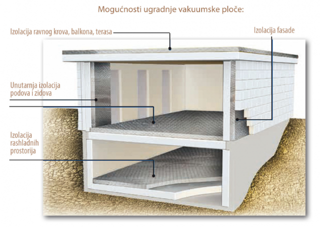 Vacuum Insulation Panels) ploče izrađene su od posebne mikroporozne jezgre zatvorene u višeslojnu foliju iz koje je izvučen zrak. Tako nastaje vakuum koji sprječava prijenos topline i daje pločama izuzetno nisku toplinsku provodljivost (λ ≈ 0,007 W/mK). Prilikom ugradnje važno je rukovati pločama pažljivo, bez bušenja i rezanja, jer svako oštećenje može umanjiti njihovu učinkovitost.
